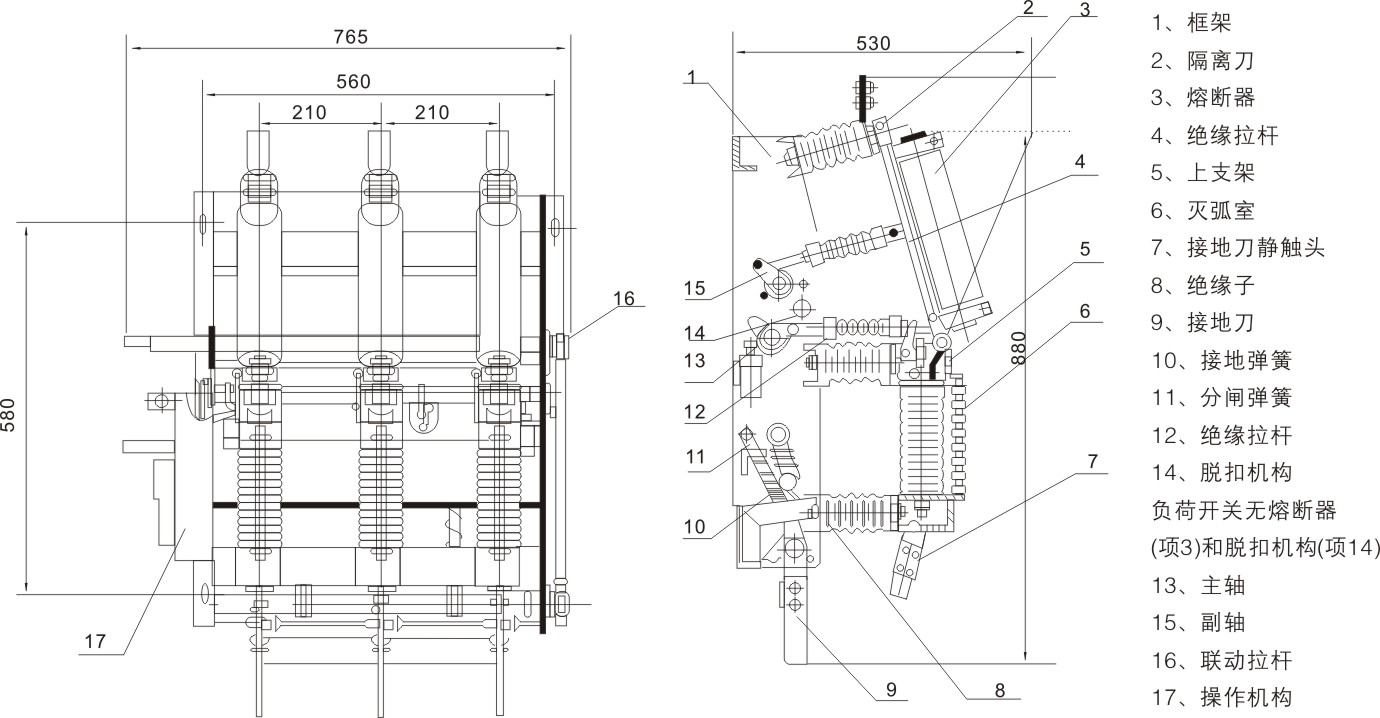 FZN21-12D/T630-20、FZN21-12DR/T125-31.5型高壓真空負荷開關及組合電器用于三相交流12KV、50Hz的配電系統(tǒng)中,具有結構緊湊、體積小、重量輕、壽命長、關合開斷能力強、安全可靠等優(yōu)點,與熔斷器配合使用(簡稱組合電器),可替代造價較高的斷路器,其操作和維護簡單方便。